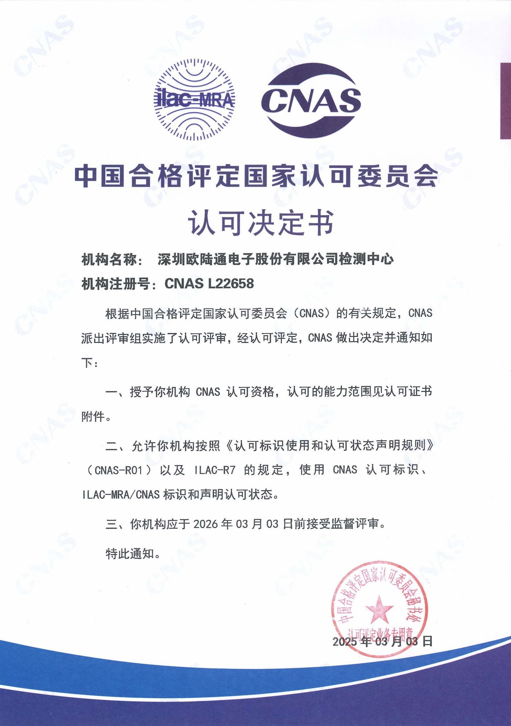 近日,歐陸通實驗室順利通過了中國合格評定國家認(rèn)可委員會(CNAS)資質(zhì)評審及合格評定,榮獲國家級CNAS實驗室認(rèn)可證書,標(biāo)志著公司實驗室的測試能力與管理體系已達到國際互認(rèn)水平,檢測報告和結(jié)果可實現(xiàn)在全球上百個國家和地區(qū)的互信認(rèn)可。